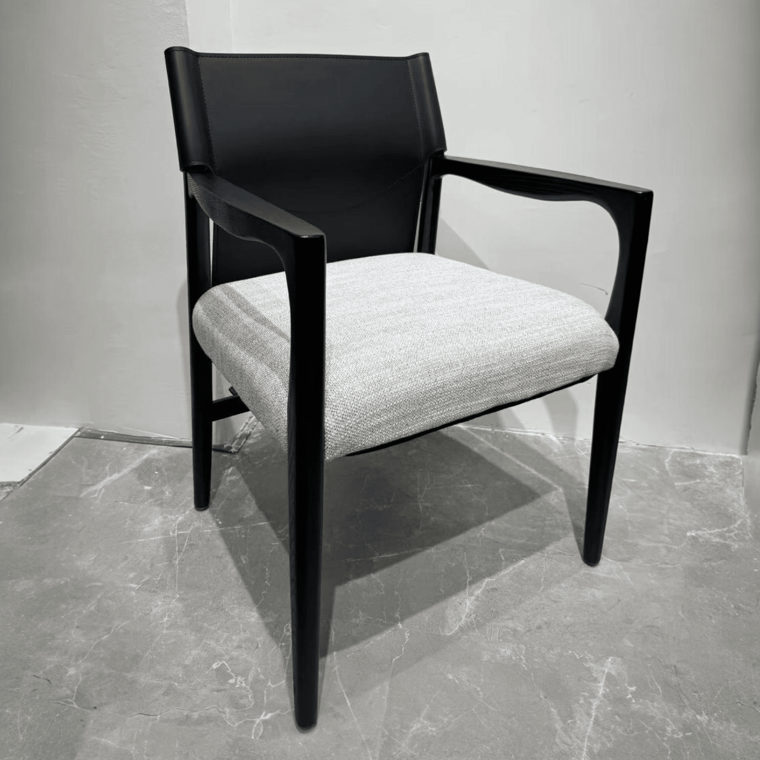 כורסא כיסא מיוחדת דגם דומיניק בעיצוב מודרני, אלגנטי ועכשווי. מושב הכיסא מרופד בבד אריג אפור בשילוב גב עור תעשייתי בגוון שחור ורגל עץ שחורה מדויקת.
