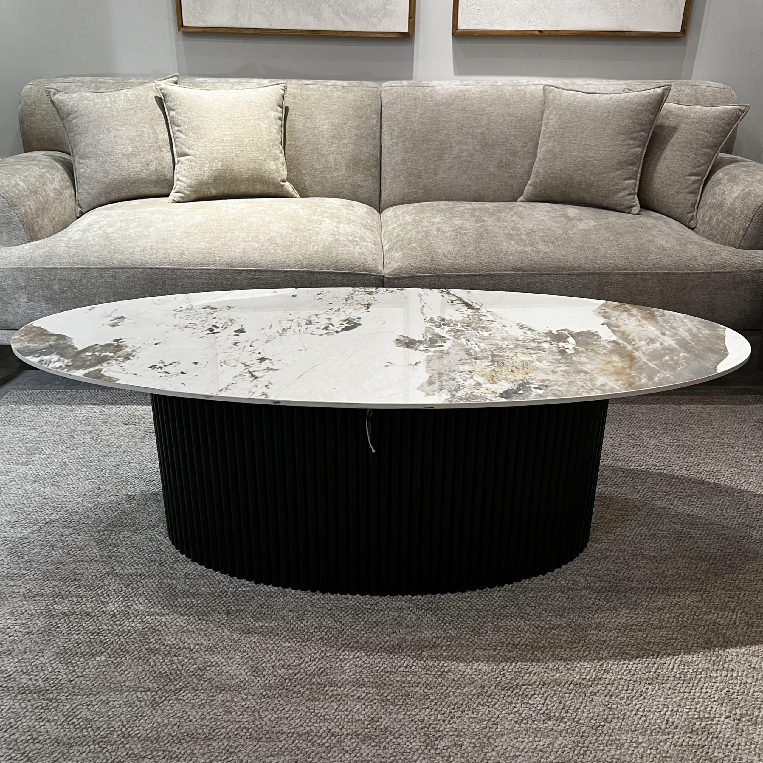 שולחן סלון יוקרתי אובלי דגם סופיטל, עשוי משטח מרבל איכותי ומפואר, בשילוב רגל אובאלית מחורצת המעניקה לו מראה מודרני ואלגנטי.