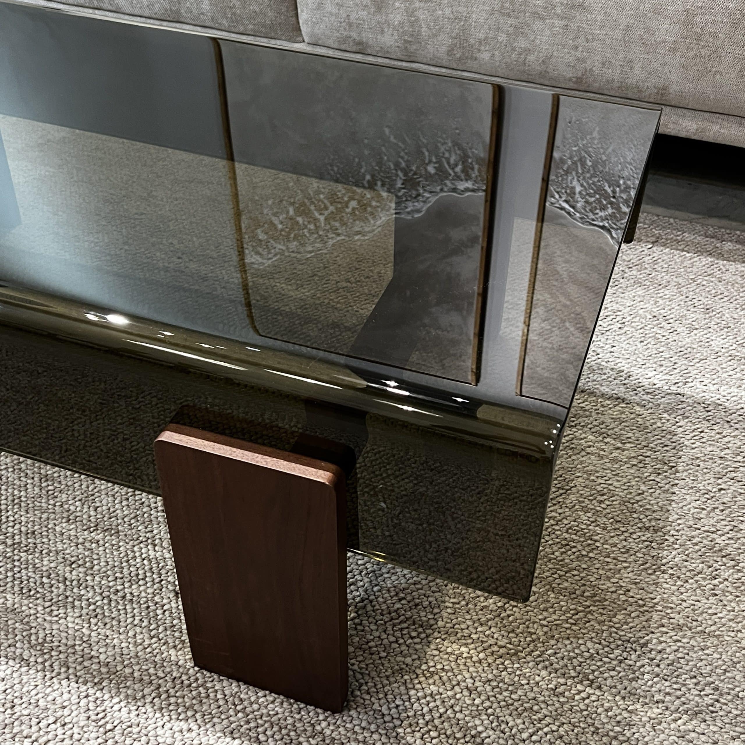 שולחן סלון יוקרתי מלבני עשוי זכוכית חומה עם רגלי עץ איכותיות, שמשלב עיצוב מודרני ואלגנטי.