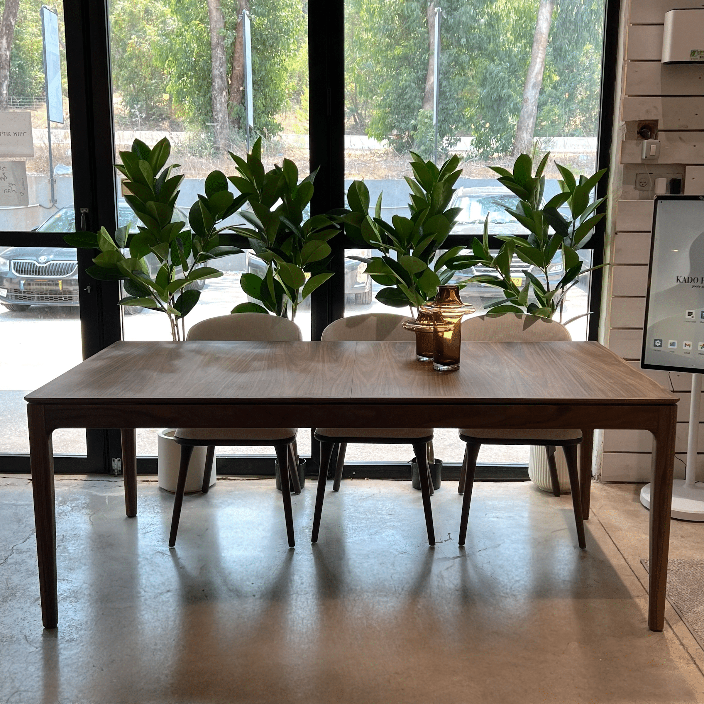 שולחן אוכל בקווים נקיים וגימור מעודן בגוון אגוז חם, עשוי עץ איכותי ובנוי בקפידה לפרטים.